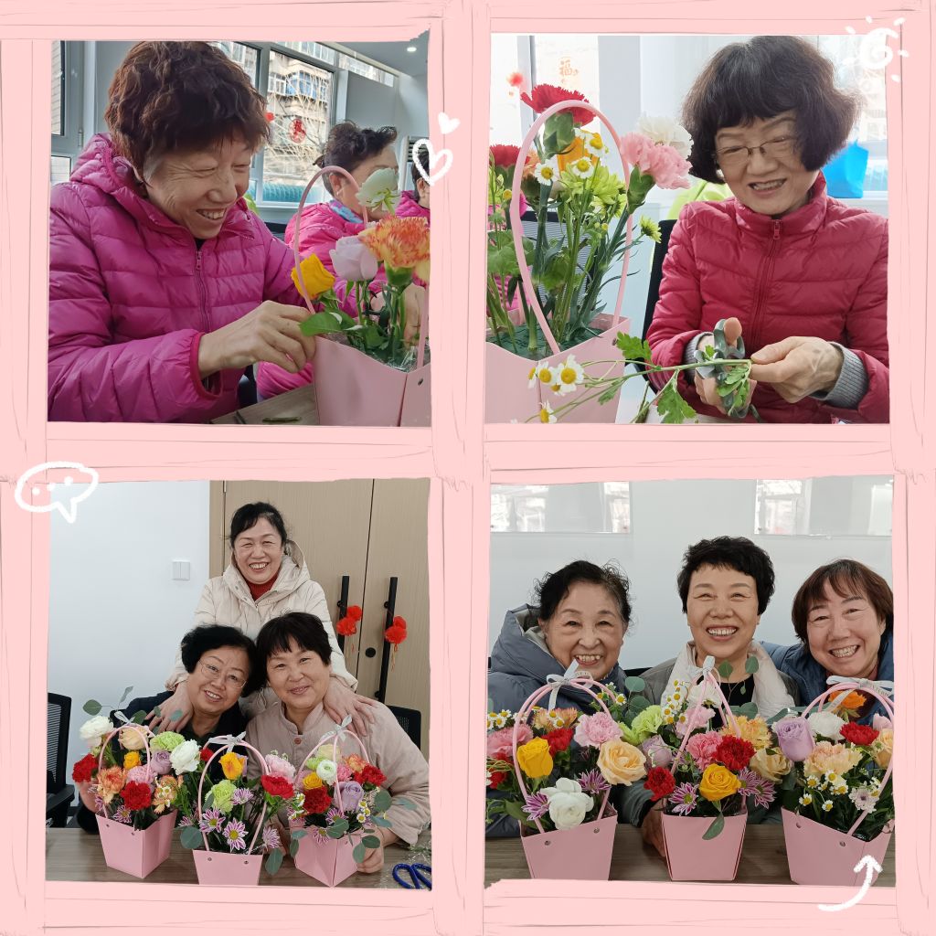 活动最后,摄影师志愿者来为参加活动的阿姨们拍照留念,阿姨们抱着自己的花艺作品笑的合不拢嘴。社工表示插花作为一种雅致的艺术形式,既能展现女性的柔美与细腻,又能够表达自由与独立的人生态度,并对所有参与此次活动的居民们送上了节日的祝福,并希望通过今天的插花活动能够让居民们感受到生活的幸福。