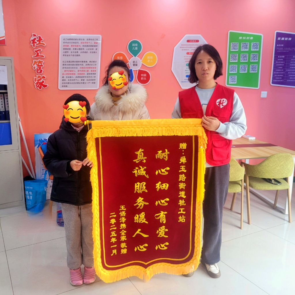 坚守初心 继续前行。一面锦旗,充分彰显了笑笑一家人对舜玉路街道社工站服务专业性的深刻认同与服务的赞誉,背后更承载着社会工作“生命影响生命”的力量。它不仅是社工们真挚关爱服务群众的有力证明,更是对社工坚守初心、持续奋斗的鞭策和鼓舞。展望未来,舜玉路街道社工站将一如既往地坚守这份信念,用心用情做好服务,为社会的温暖与和谐持续贡献自己的力量。