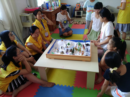 8月23日下午,三涧溪夏令营之心理沙盘再次开课,参加这次活动的除了有夏令营的孩子们,还有我们的社工们也加入其中。 此次沙盘心理游戏,社工专门请的心理专家老师来进行指导,孩子们和社工们分成2队。在认真听完心理老师的讲解后,孩子们和社工们分别给自己队伍设计了沙盘主题,然后分别拿了自己喜欢的沙具放在沙盘里。老师让2支队伍进行了4轮的沙具摆放,参与活动的孩子和社工们按照自己的意愿随意拿取、摆放或挪动沙具。在4轮沙具摆放结束后,老师根据孩子们和社工们各自的行为进行了心理的解析和指导,并对两支队伍设计的动物乐园和自然乐园进行了心理分析。此次心理沙盘活动不仅使孩子们自身的身心健康得到发展,还增近了孩子们与社工们之间的更深层次的认识和交流。