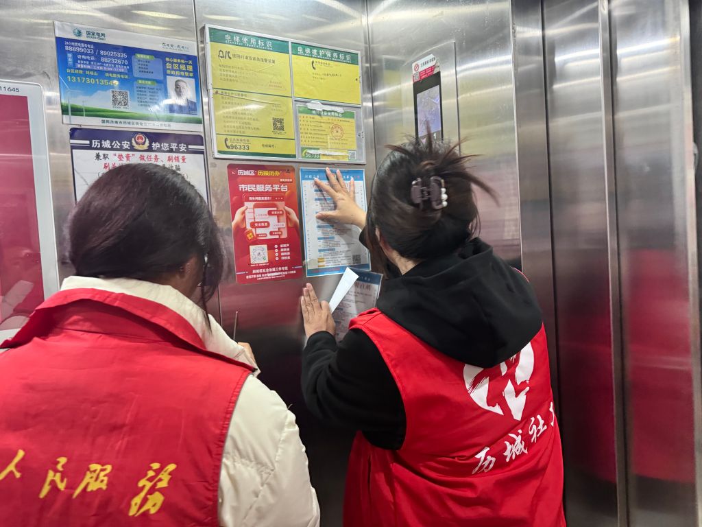 与此同时,另一组大学生志愿者们在站点社工的带领下在社区楼道内忙碌起来。他们仔细检查楼道内的消火栓,查看设备是否完好有效,确保消防设施在紧急情况下能够正常使用。他们还在楼道内张贴反诈宣传单,进一步扩大反电信诈骗宣传的覆盖面,让居民们在日常生活中随时随地都能了解到反诈知识。