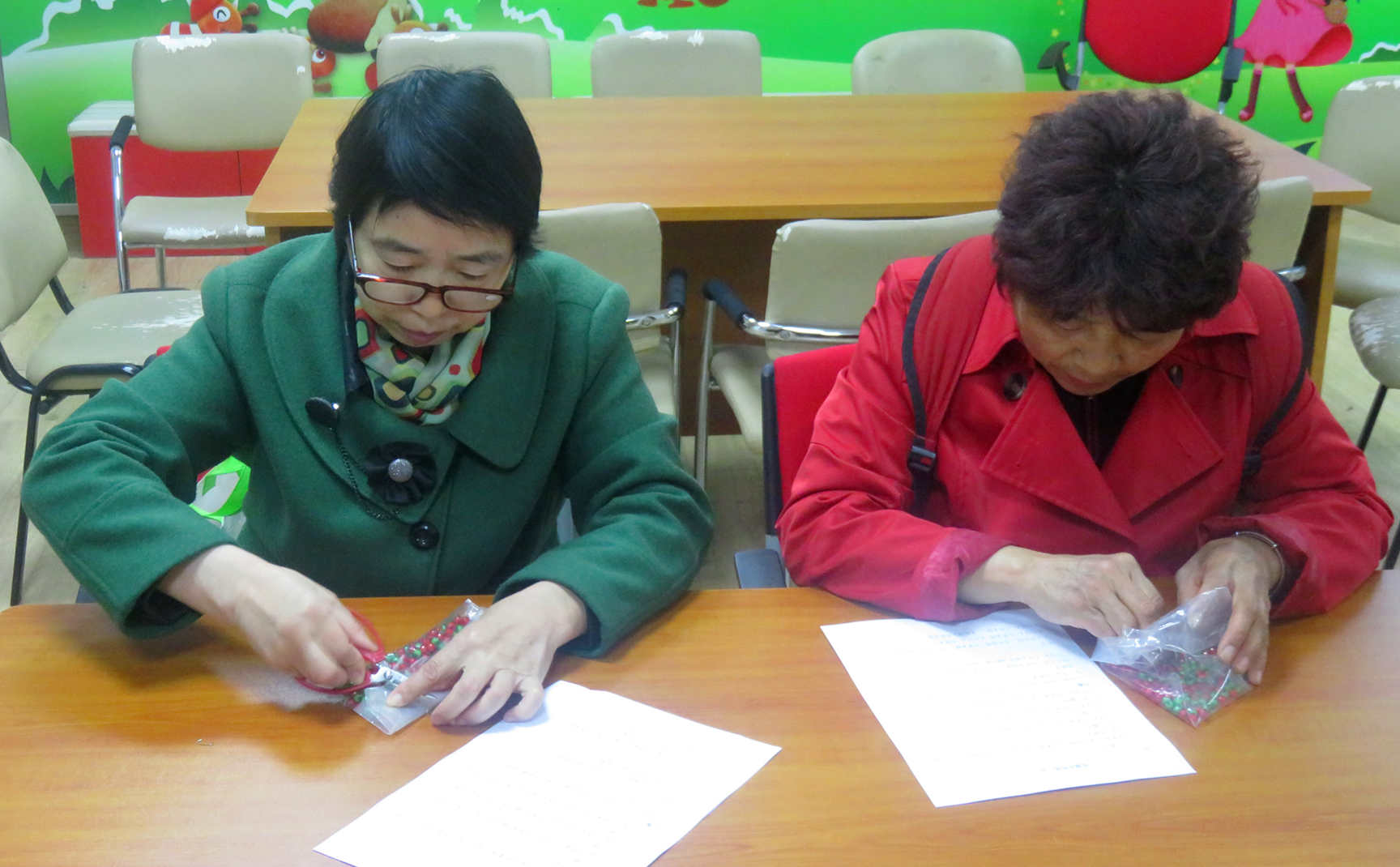在组员进行签到后,社工针对串珠的基本方法进行了详细讲解:如何串珠、怎么打结、如何走线等。接下来,社工讲解今天的手工串珠——玫瑰花。项目组社工与山东建筑大学的两名实习生一起耐心、手把手教学,不一会功夫组员学会了串珠的要领,大体掌握了如何制作玫瑰花串珠技巧。在动手制作的过程中,组员一起探讨制作流程,互相帮助,气氛融洽。组员与社工、实习生一起行动,巧手生花,制作精美物件。