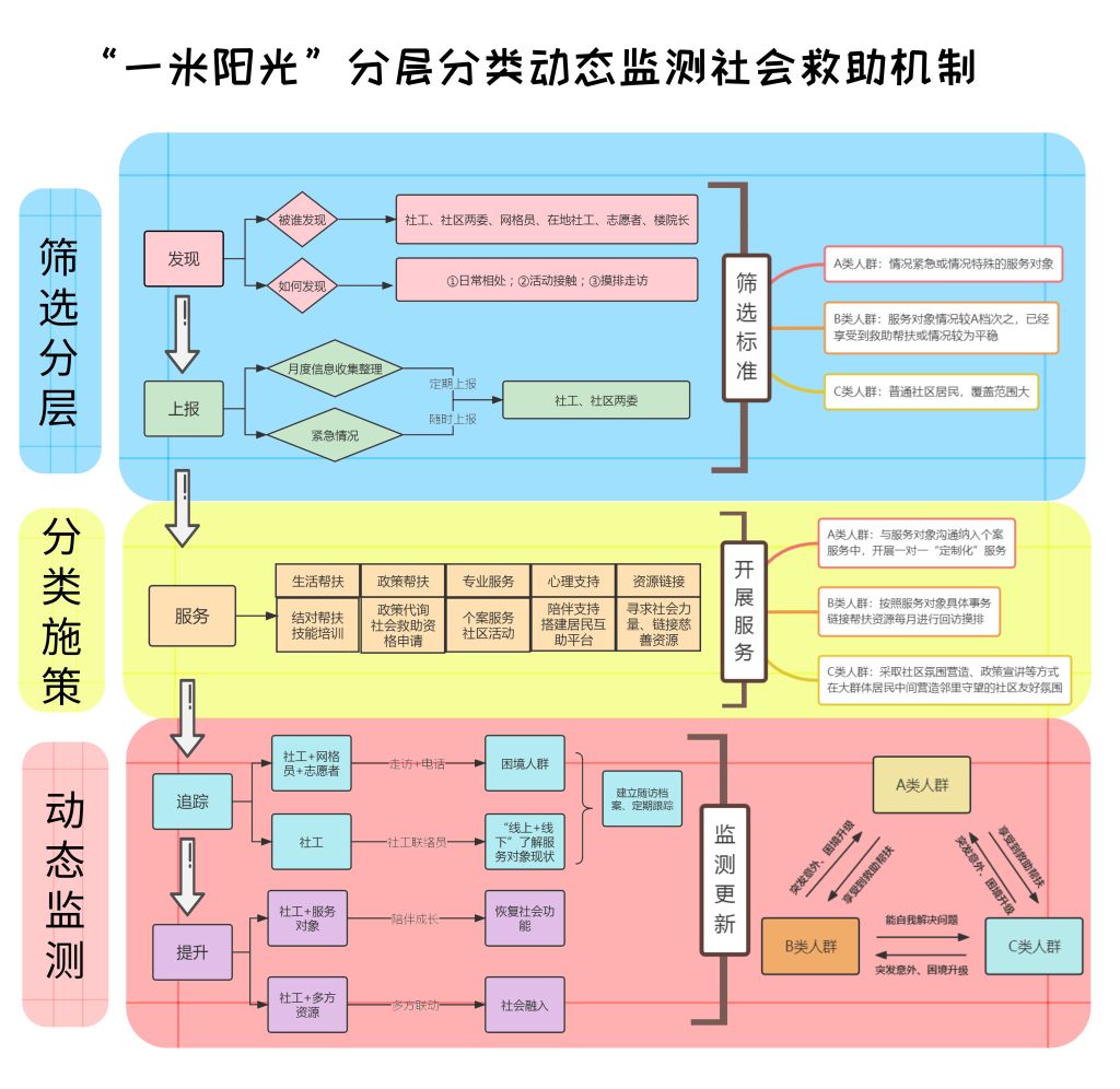 所谓动态监测,社工站面对已经分层分类的救助对象不能一成不变的进行帮扶,通过社工进行个案服务以及结案的A类人群可以在评估结束后降档为B档或C档;同样,B、C类人群如遇到紧急变故也会升级为A类帮扶。社工站与“信息上报员”一起,通过居民之间日常相处,以及社工站组织活、摸排走访以及帮扶对象的回访,从单一救助、粗放救助提升至多元救助、动态观测、长期关怀。