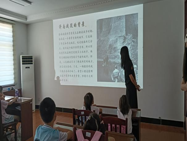 活动伊始,通过播放精心剪辑的红色主题短片,迅速吸引了孩子们的注意力,并以此为契机,由志愿者们通过提问互动的方式,自然引出活动主题。随后,志愿者们以济南市著名的济南战役为切入点,深入浅出地讲述了抗日战争、解放战争等历史时期的故事,引导孩子们重温革命历史,缅怀革命先烈,深刻理解爱国主义精神的内涵与价值。