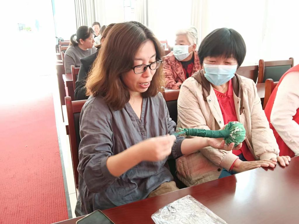 活动现场,社工邀请静心心理咨询师孙燕丽老师为现场的老年人带来暖场游戏--秋季保健操。保健操结束后,孙老师又引据经典讲解了重阳节的文化、习俗及相关的健康知识。孙老师尤其讲解了艾草锤的养生功效及制作方法。随后社工与孙老师一起为老人们演示了养生艾草锤的制作步骤,介绍了制作艾草锤具体所需的材料。