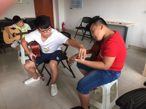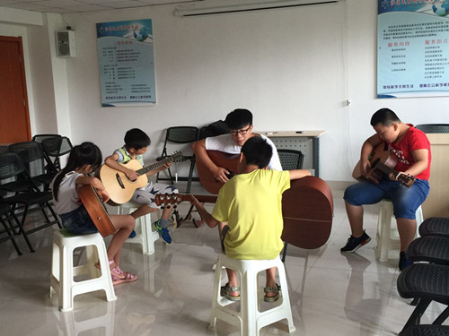 课程分为儿童组和成人组,儿童组为每周二周四全天上课,成人组为每周六下午上课,每班实行小班制教学,只有四名学员,一共有四周的课程。课堂上,吉他老师把自己多年学习吉他的感受、体验、经验和方法,用通俗易懂、精炼准确的教学语言传递给学生。手把手的教授学生专业弹奏知识,因为大多数学员是零基础,所以老师从吉他基础入门开始,进行教授,交给学员们怎样拿吉他,怎样拨弦,乐理知识等。