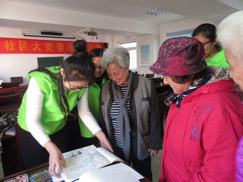 首先,由社工给老人作业盖章。有的老人在完成课堂学习的基础上,练习自己喜欢的图画,还有老人开始尝试手绘日记,用图画记录生活,学习的积极性和主动性显著提高。随后,由高校志愿者带领老人做热身游戏“大雨小雨”,深得老人喜爱。