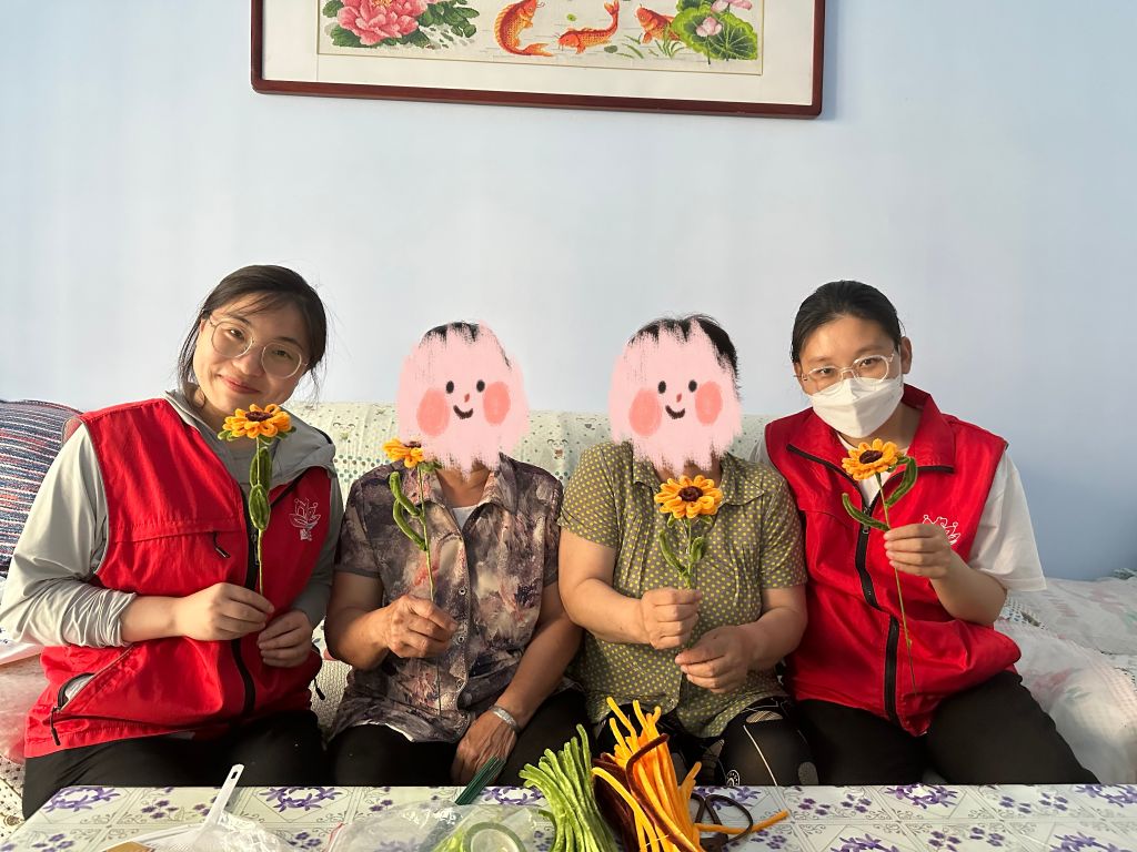 服务对象与志愿者共同制作手工花朵