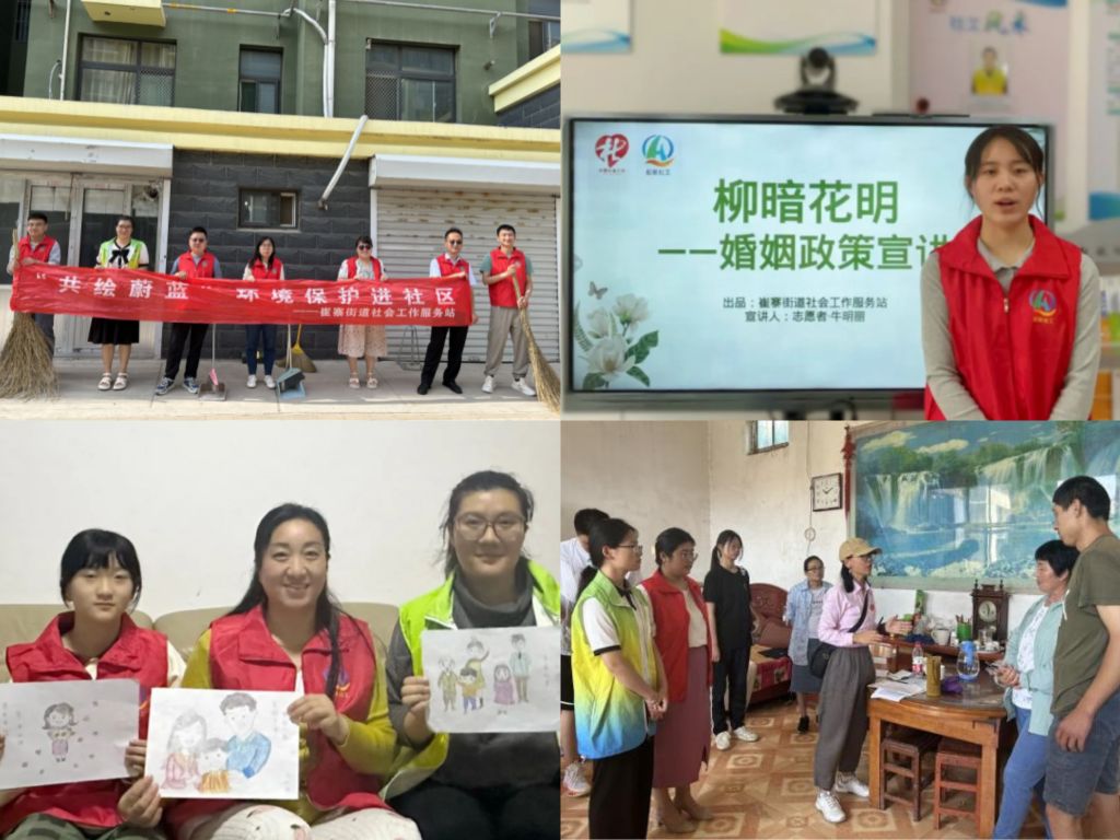 崔寨街道社工站通过“微光”志愿服务平台,将“崔寨·起航”志愿者队伍与全街道69支村居志愿服务队相结合,以“社工+志愿者”的模式,共开展“予人玫瑰”手绘插画志愿服务、“柳暗花明”婚姻政策宣传活动、“清明多方联动,助力绿色殡葬”志愿活动、“社志联动”守护家园活动、“手拉手”孤困儿童走访活动等6场志愿服务活动,充分发挥志愿者的力量,使其影响到更多的社区居民,使社区“它治”逐渐转变为社区“自治”。