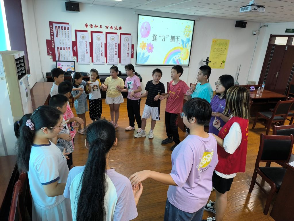 温暖陪伴,守护成长。社工带领成员们开展逢“3”抓手热身游戏,“在一个风景秀丽的小山村里……”故事正式开始,成员们认真地聆听,一边要尽力抓左边同伴的手,一边还要躲避右边同伴的进攻,生怕一个不注意,抓握的机会从眼前溜走。在紧张刺激的热身游戏之后,社工播放小组的回忆视频,带领成员回顾小组的精彩瞬间,“这是我们第一节课刚认识”“这是我们一起做旋转蜻蜓”“这是一起做漆扇”“这是一起拼中国地图”,一张张影片瞬间唤起成员彼此间朝夕相处的回忆。
