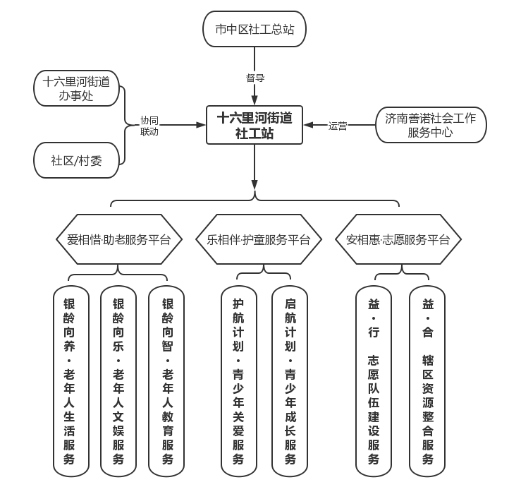 十六里河街道社会工作服务站是由济南市市中区民政局出资购买,济南善诺社会工作服务中心承接运营。社工站实施“社工+”的服务理念,探索出413N的工作模式,即“十六里河街道办事处、社区及村委、市中区社工总站、济南善诺社会工作服务中心”四方共建,指导十六里河街道社工站在“爱相惜·助老服务平台”、“乐相伴·护童服务平台”和“安相惠·志愿服务平台”三大服务平台下开展N项社工服务。.png)