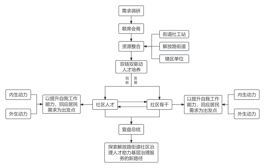 为引导社区治理人才聚焦低保、低边、高龄独居等民政在册群体,赋能社区治理人才发挥内生资源优势,解放路街道社工站计划从三级精英学院项目中衍生出社区人才培养学院,因此,联合后坡街社区,基于社区治理人才自我工作服务能力提升的需求,发挥新质生产力效应,构建了社区人才与社区骨干相互联动的“双链双驱动”的社区治理人才培养体系,以助力多元主体有效参与社区治理,切实回应困难群体多元化需求,探索解放路街道社区治理人才助力基层治理服务的新路径。