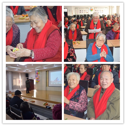 首先,由郭院长与吴院长为老人们带来新春的祝福,为老人送上一条条温暖如火焰、艳红似晚霞的围巾,祝爷爷奶奶们新的一年身体健健康康、天天喜气洋洋、日子红红火火、生活充满阳光!领导们的讲话为今天的联欢会活动拉开序幕。接下来是老人们大展身手的舞台,一首首优美的老歌引起了所有老人的大合唱,《英雄赞歌》、《天仙配》、《我们工人有力量》、《打靶归来》等,你方唱罢我方登场,其乐融融。活动接近尾声,社工组织了抽奖活动,抽中的老人可以得到一份项目组和老年公寓精心准备的小礼品,礼物虽轻情意却重。