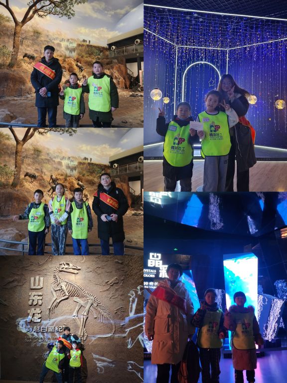 进入博物馆后,社工带领成员们依次参观了“非洲野生动物大迁徙展”、“山东龙—穿越白垩纪”、“晶·彩矿物精品展”、“三千玲珑——中国海洋贝类展”五个展厅,每个展厅主要包含社工讲解与自由参观两部分,“这是巨型山东龙的骨骼化石,它是世界上已知的最大的鸭嘴龙类恐龙,站起来能有8米高,是恐龙家族中名副其实的‘山东大汉’”……社工为成员们讲解展厅内的特色展品,成员们时不时的还会与社工互动,“我才1米4,八米高这都赶上好几个我了!”。在社工讲解完毕后,成员们依照自己的兴趣,选择自己感兴趣的展品仔细观看,“志愿者姐姐,你猜最小的这个是什么蛋?是蛇蛋!”成员兴奋地将自己了解到的知识分享给志愿者。成员们在认真倾听社工讲解以及自己参观的过程中输入知识,又在给他人讲解的过程中将知识输出,无形之中加强了自身对知识的了解和掌握。