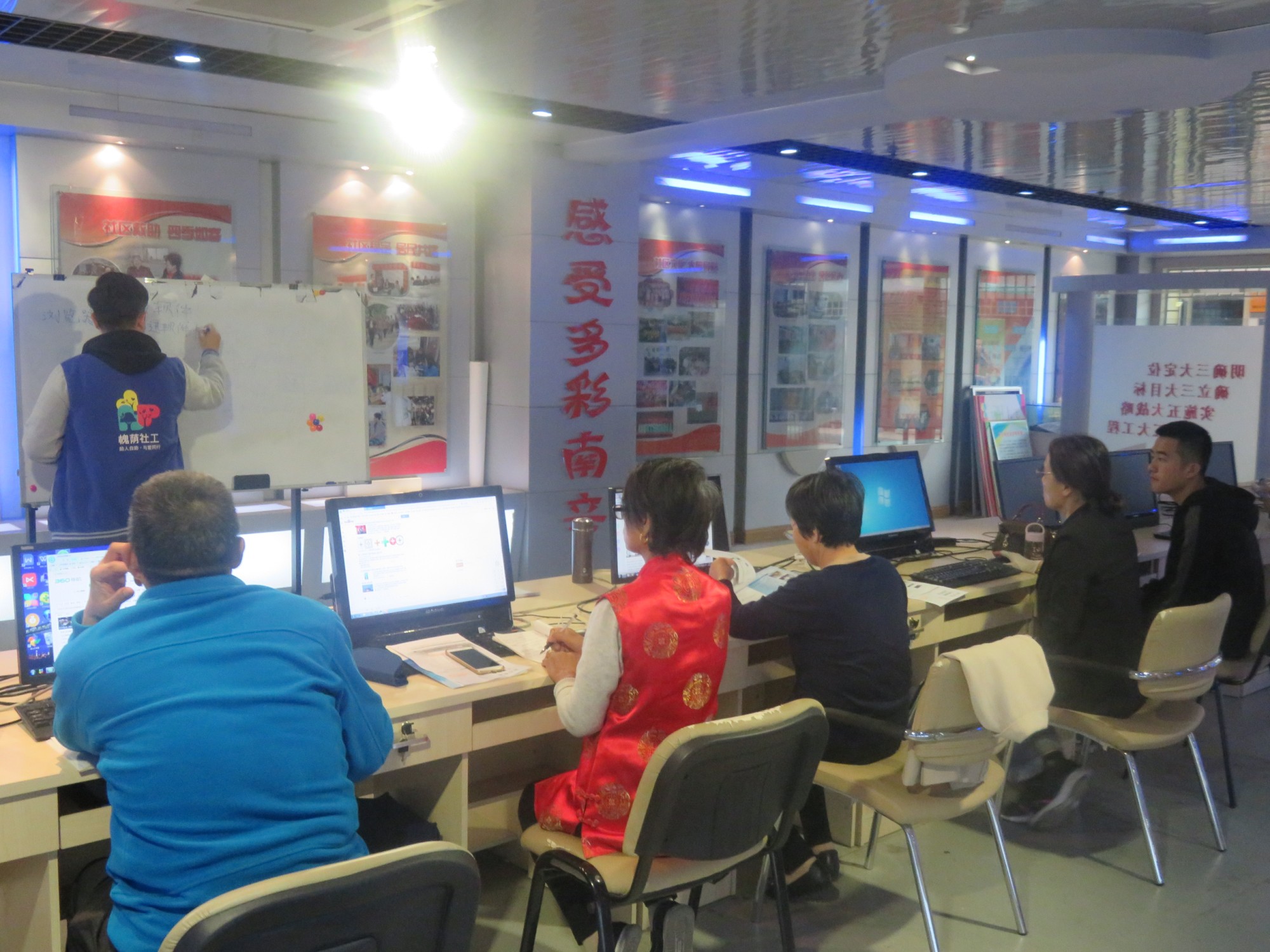课程伊始,项目组社工首先让小组成员回忆一下上节课的学习内容,自己简单操作一下看看熟悉程度,随后项目组社工又在黑板上简单陈述了一遍上节课教的软件、音乐视频的下载,给小组成员加深了印象。课程回顾结束后,项目组社工又带领小组成员开始新课程的学习,本次课程教学内容是文件夹的使用,复制粘贴等实用性电脑使用技巧,以此方便小组成员在下载完音乐或视频后对电脑及软件的进一步方便使用。项目组社工和项目组实习生根据组员的学习情况一一对组员提出的问题做出解疑,并引导组员能够自主探索解决问题。课程结束时,组员已经基本能够掌握课程教学的内容,并且对旧知识也有了充分的复习回顾。