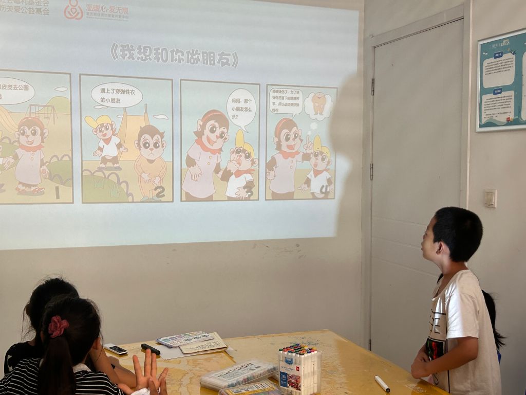 活动伊始,社工向孩子们简要介绍了烧烫伤的相关知识,以及本次活动的目的和意义,点明活动主题——接纳和关怀烧烫伤患者。随后,孩子们在社工的引导下,共同阅读了《我想和你做朋友》漫画,通过生动的故事情节,让孩子们对烧烫伤患者的生活有了更深刻的理解。
