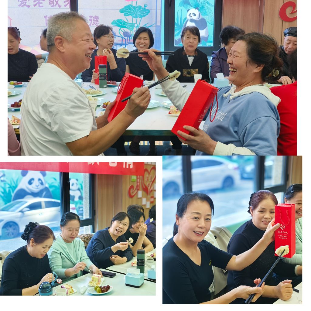 活动伊始,驻站社工首先向大家致以诚挚的节日问候和祝福,随后社工带领大家进行专注力训练小游戏,听到水果请拍手,听到蔬菜请拍腿,在社工一声声口令下,大家精神紧绷,时而哈哈大笑,时而眉头紧锁。随后社工引领老年人进行红歌大合唱,老人们精神饱满,歌声嘹亮。一首首经典的红歌,唱出了他们对祖国的热爱,对美好生活的向往。在激昂的歌声中,老人们仿佛回到了过去的岁月,回忆起那些难忘的时光。老人们一边欣赏节目,一边话家常。活动尾声,社区日间照料中心还专门为老人们准备了热腾腾的水饺、美味的蛋糕以及保温杯,他们个个喜上眉梢,脸上洋溢出幸福的喜悦,现场氛围热闹而温馨。