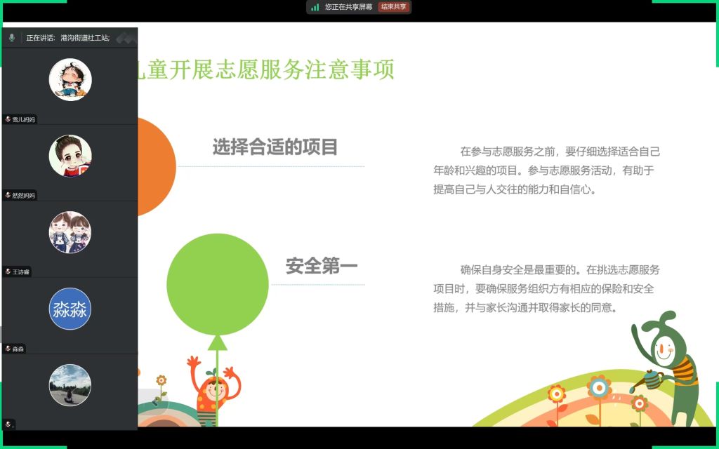 为进一步培养组员的社会责任感,引导组员规范开展志愿服务,提升他们的志愿服务能力。11月11日,港沟街道社工站开展“青春志愿行,服务‘益’起来”—儿童成长小组第四期,为组员进行志愿者线上培训活动,旨在提高组员的志愿服务意识和能力,为社区治理注入新鲜力量。