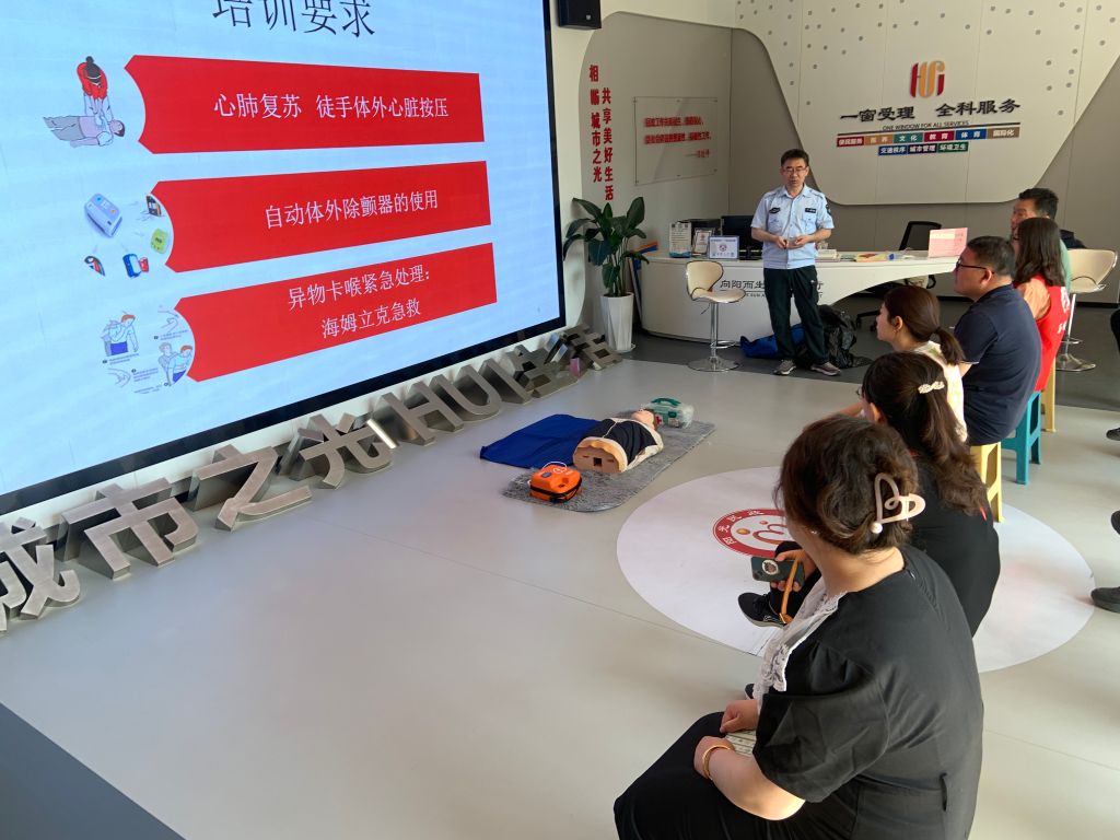 培训正式开始,来自千佛山医院120急救中心的黄医生以理论与实操相结合的方式为居民讲解了心肺复苏、人工呼吸、AED机的操作以及气道异物梗阻等应急救护知识,演示了CPR+AED和海姆立克急救法的具体操作步骤,并通过现场上台实践的方式指导大家积极参与到学习中去。培训过程中,在场居民朋友们积极互动,认真学习急救方法,现场活动氛围浓厚。