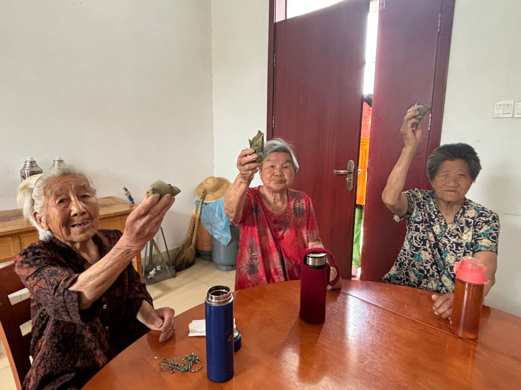 与村干部深入交流后得知,来共享这顿饭的竟是一群八十岁以上的高龄老人。其中,一位慈祥的奶奶向我们倾诉道:“感谢你们的心中还挂念着我们这些老人,来为我们包粽子,陪伴我们这些老头老太太共度端午节。”一片片清香的粽叶、一粒粒晶莹的糯米,在一双双巧手下,一个个鲜绿的粽子就这么诞生了。活动现场一片欢声笑语、其乐融融。
