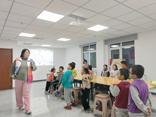 “雪雪落无痕,小雪时节都有哪些习俗、特点呢?又有哪首古诗词描写了小雪呢?有哪位小朋友可以告诉我呀?”“我!冬腊风腌,蓄以御冬,我奶奶要灌肠腌咸菜!”“我我我!我刚学了一首诗,莫怪虹无影,如今小雪时!”活动现场,不乏小朋友踊跃互动,但社工细心发现一名内向的小朋友始终在犹豫,在几次分享过后,社工通过不断的眼神肯定、轻声鼓励,最终勇敢的举起小手,成功分享了自己的体会,随着他的落座,小背挺得更直,眼神也更加坚定。