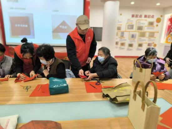 在社工的引领下,居民们纷纷拿起铅笔在红纸上画出各式各样的图案,接着拿起剪刀进行修剪,没一会儿,一幅幅剪纸作品就诞生了。亓阿姨拿着自己的作品高兴地给社工说:“我们剪出来的这些不仅展示了剪纸艺术的魅力,更传递了环保的核心理念,通过你们这个活动也激发了我们对环境保护的热情,也想对环保事业尽一份力!”