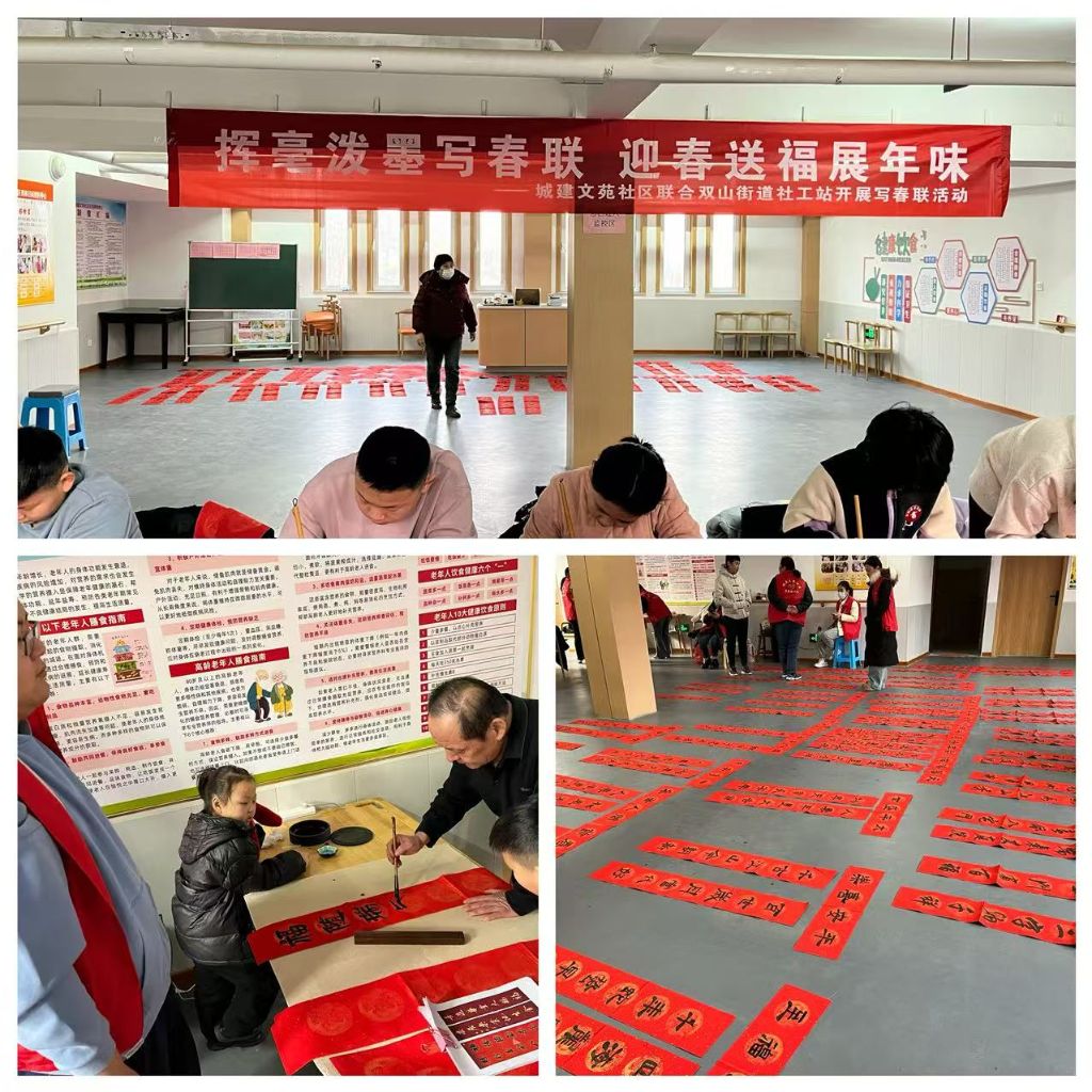 春节是中华民族最重要的节日,春联作为春节传统的重要组成部分,不仅承载着美好的祝愿,还能体现书法艺术和文化传承。双山街道社工站联合城建文苑社区、中国硬笔书法协会会员,开展“挥毫泼墨写春联,迎春送福展年味”活动。