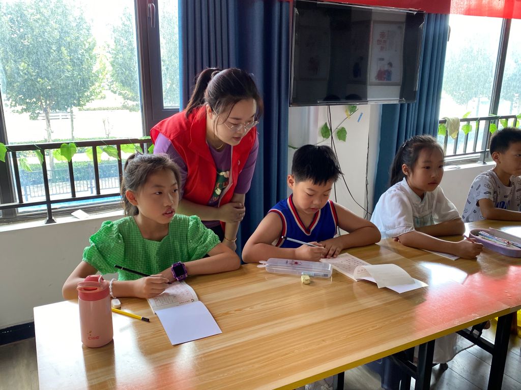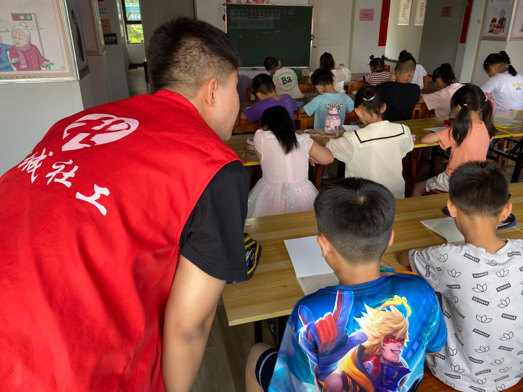 在书写过程中,社工协助老师对于不同学龄段的孩子进行一对一指导。针对每个孩子对硬笔书法的掌握程度,提出相应的练习方向。引导孩子研究字体笔画长短,仔细观察“横”的方向,注意左低右高,还提到每个笔画长短都要均衡。樊老师还着重强调起笔时需要停顿的细节。