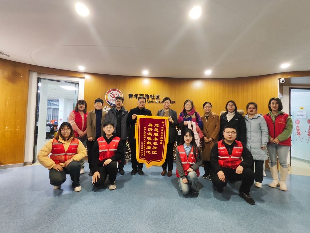 为向山东大学药学院多年来对青年西路社区周末星宝课堂的贡献,街道和社区向山大药学院赠送志愿服务锦旗。同时,山大药学院向青年西路社区的困难学生家长代表赠送书包、笔记本等学习用品。