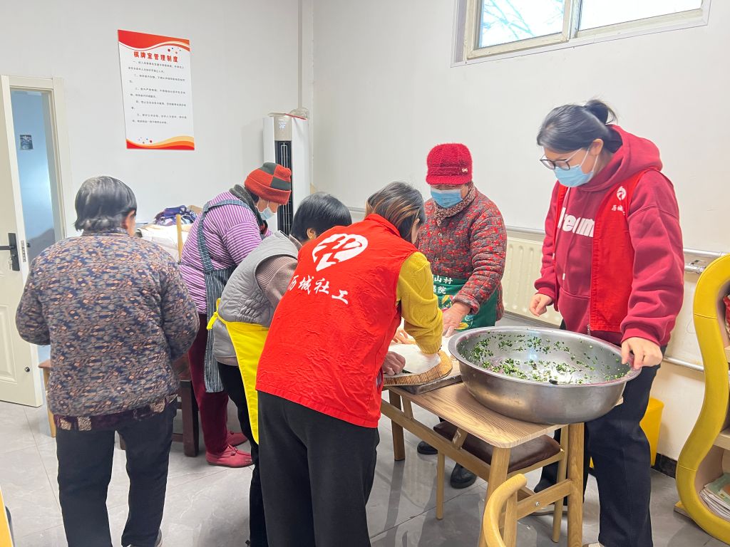 活动当天,社工们早早抵达幸福院,同院内工作人员一起忙碌起来,大家分工明确,有的和面、有的擀皮儿,为中午的餐食助力。随后,老人们陆续登场,为活跃现场氛围,为老人带去更多欢乐,社工同志愿者带领大家跳起自创的“养生操”,大家跟着节奏拍八虚,一阵阵欢声笑语充斥在耳畔。李爷爷(化名)开心的说“你们来,这天都亮堂了,饭菜香,心里更暖”。服务过程中,驻站社工耐心倾听老人的心里话,在交流中精准评估老人们的心理和生活需求,为后续个性化服务筑牢根基。