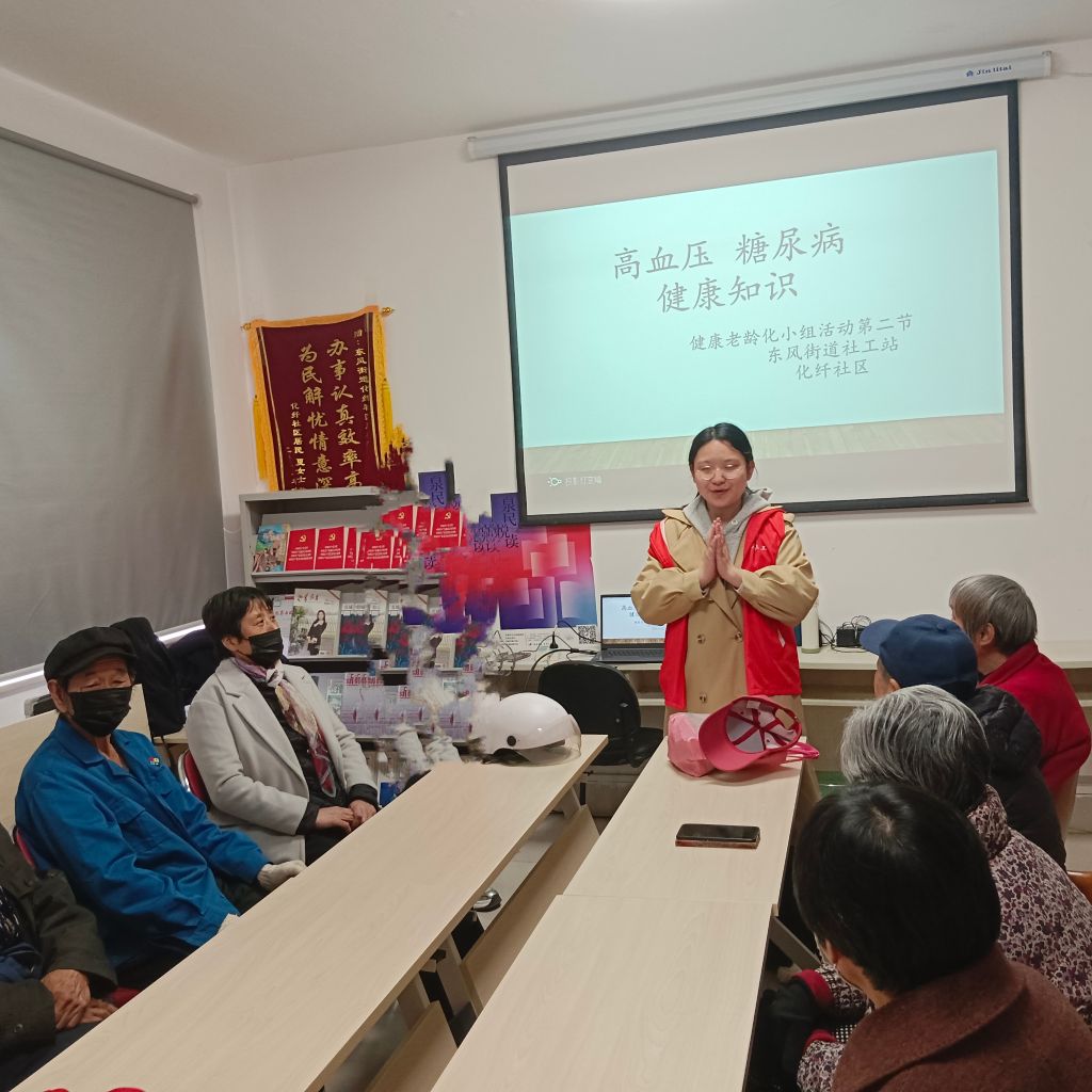 为提高辖区老年人健康素养,增强社区老年人的身体健康,满足辖区老年人对健康知识的需求。3月22日,东风街道社工站开展了“岁月静好,悦活养生”老年健康教育小组第二节活动,此次小组活动以“守护健康--高糖葵花宝典”为主题,主要为小组成员讲解有关高血压、糖尿病的知识。