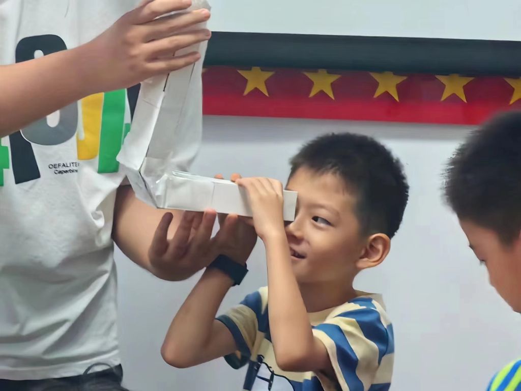 在科学知识科普环节,社工利用白纸、胶带等材料制作了一个“简易版”潜望镜并向同学们展示,“潜望镜是利用两个反射镜使物光经两次反射而折向眼中。”社工用浅显易懂的语言为同学们讲解了潜望镜的制作原理、实际应用等,教同学们用最简单的方法自制潜望镜。通过社工的引导,同学们利用自制的潜望镜观察着不同平面的物体,直呼“太神奇了!我喜欢探究物理,科学的世界太有趣了!”此项活动将整堂课的氛围推到高潮,同学们相互交流着自己的想法,同学们望着自己精心制作的作品,内心充满了自豪感和成就感。此次小组活动给孩子们在心里播下科学的种子,让孩子们进入科学世界里探寻奥秘,体会科学的乐趣。