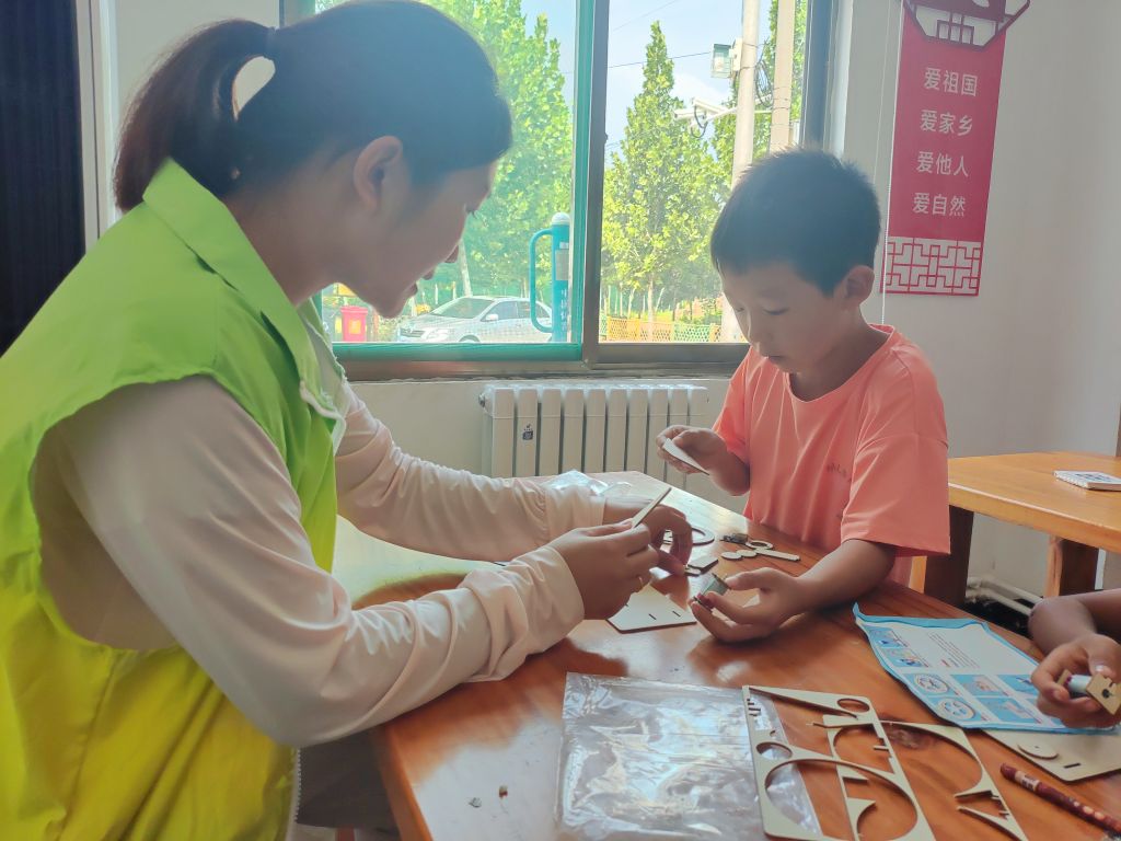 社工将已经完成的作品给大家演示,旋转大滚轮的手柄,带动马达反向旋转,在外力的带动下线圈在磁场当中作切割磁感线运动产生感应电动势,由此点亮灯泡。小朋友们无不惊讶科学的神奇之处,自己也动手进行组装,活动中,社工手把手帮助小朋友将零件仔细地拼装起来,从连接电线、固定螺丝到组装完成都非常考验孩子们的耐心和细心。“老师、老师,这个怎么装?”稚嫩的声音此起彼伏,孩子们在社工与志愿者的帮助下完成了木板的拼接、电线的连接以及最终的发电测试,参与活动的孩子们们亲手完成一个又一个步骤,体会到了动手制作的乐趣,感受到了科学的魅力。