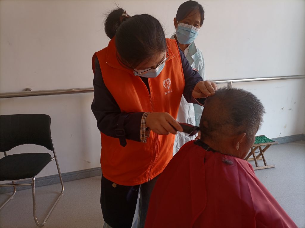“大爷,您想剪什么样的发型?”敬老院中,社工化身“理发师”,摆好小方凳,手持理发工具,耐心的向老人们询问对理发的要求。