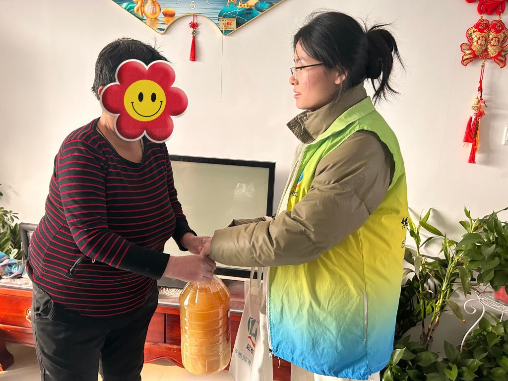 首先来到了村民李大爷家。李大娘因腿部残疾行动极为不便,生活起居多有困难。当工作人员们带着新春物资走进他家时,李大娘正坐在老旧的椅子上休息。看到大家的到来,他眼中满是惊喜。社工快步上前握住李大娘的手,亲切地说:“李大娘,快过年啦,我们来看您,给您送点年货!”说着,将米和油放置妥当。随后,大家围坐在李大娘身边,仔细询问她最近的身体状况,生活上有没有什么困难。李大娘感动地说:“我这腿脚不好,平日里多亏了你们挂念,这过年的东西都给我送来了,太感谢了!”