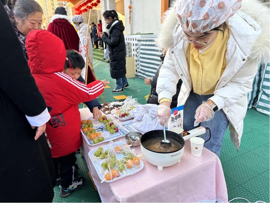 糖葫芦芦制作活动摊位上,社区志愿者向孩子们讲解冰糖葫芦的历史、制作过程以及注意事项,嘱咐小朋友们注意安全。在社工指导下,孩子们全情投入,用心学习和感受制作冰糖葫芦传统技艺的独特魅力。
