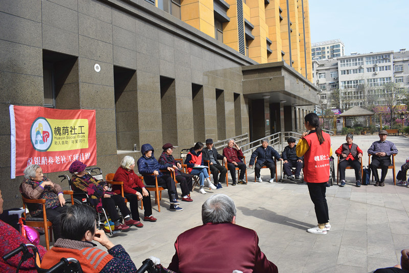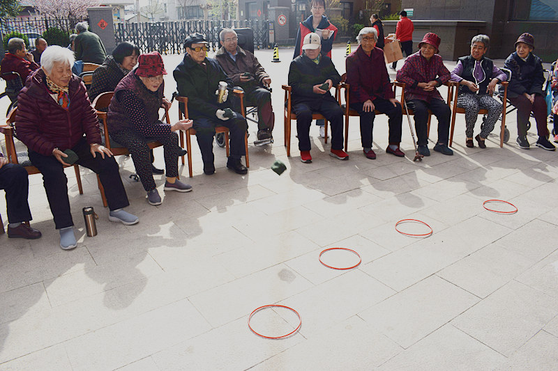 活动开始前,社工在院子里把凳子围圈摆放,并将活动需要的物资都一一准备好,接着便去每一个楼层把不常出门的老人也都带了出来。上午九点,活动准时开始。社工先组织老人们进行了简单的自我介绍,并让老人们都记住左右两个人的名字,接着,老人们就踢起球来,社工喊停时靠近球的老人要说出身边两位老人的名字。“传球记名”的游戏结束后,社工又带领老人玩了“平衡球”、“丢沙包”、“数字成语接龙”的游戏,老人们的欢笑声此起彼伏,引得一些家属与工作人员也前来围观、叫好。
