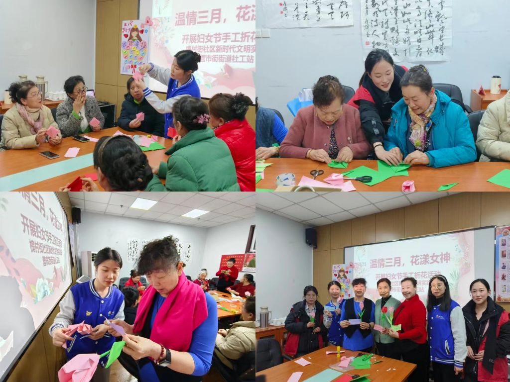 槐村街社区手工折花活动。活动开始,社工向参加活动的老年人讲解了手工折纸花的制作方法。老人们对折花活动非常感兴趣,积极动手,互相帮助。经过努力,制作出一朵朵精美的折纸花。作品完成后每人获得了一份由社工和志愿者精心准备的妇女节玫瑰寄语节日祝福。
