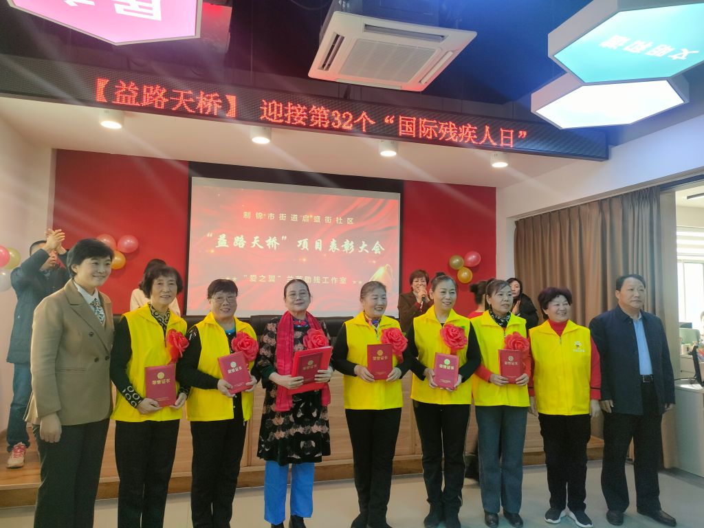 在国际残疾人日即将到来之际,为了进一步倡导社会各界关注残疾人的需求和权益,提升残疾人融入社区、参加志愿服务的效能感。11月29日上午,济南市天桥区制锦市街道社工站联合启盛街社区、社区社会组织共同开展关爱残疾人暨表彰先进会活动。山东省残疾人联合会直属机关党委专职副书记陈红光,山东省残疾人联合会人事部一级主任科员刘俊,天桥区残疾人联合会党组书记、理事长惠祥利,天桥区残疾人联合会党组成员、四级调研员聂岭,制锦市街道办事处副主任温辉,启盛社区党委书记米玉,济南市“快乐一家”社会组织服务中心主任杨蕾,“爱之翼”兰英助残工作室主任石兰英等领导同志出席会议。