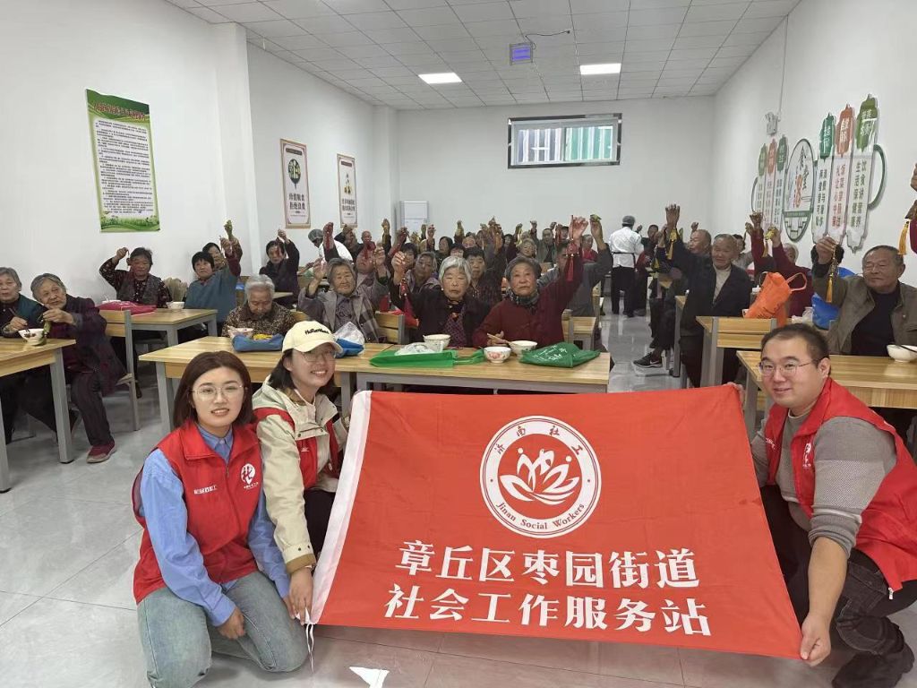 雨晴篱菊初香,人言此日重阳。10月23日,农历九月初九,又是一年重阳时。“九九”谐音“久久”,有长久长寿之意,故重阳又添孝亲敬老之意。慈孝无亲疏,高龄皆父母,以涓涓细流温暖老人心田,以浓浓深情传递温暖和关爱,在重阳节到来之际,枣园社工站联合街道新时代文明实践志愿者、枣园医院,在明山联村日间照料中心开展丰富多彩的尊老敬老活动、创新推出助老护老暖心服务等方式,传承弘扬敬老爱老传统美德,共迎重阳佳节,为老人送去浓浓的关爱和祝福。