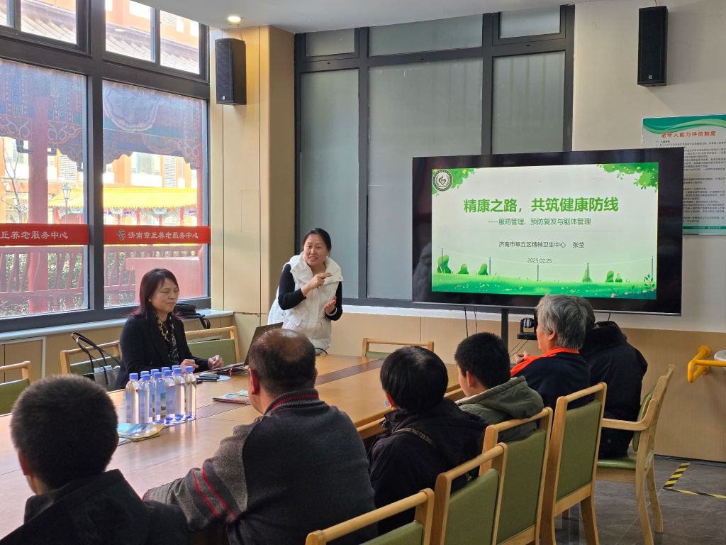 2025年2月28日,为深化精神障碍患者康复服务,双山街道社工站联合精神卫生中心,在章丘区养老服务中心开展“服药管理、预防复发与躯体管理训练专项服务”活动。活动聚焦亲历者居家康复核心需求,通过"专业讲座+趣味互动"形式,为20余名亲历者及家属提供科学指导与情感支持,助力构建“医院-社区-家庭”三位一体服务网络。