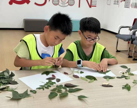 活动开始前,社工给大家科普各种树木形状颜色千奇百怪的树叶、树木病虫害及防治知识。然后就是户外环节,因为小区内绿化茂盛,各种不同的植物较多,便成了户外环节最好的“探险”地。他们或低头寻觅,或驻足欣赏,每一片树叶都仿佛是大自然赋予的独特色彩,等待着被发掘和创作。在最后的“植物印刷术”环节中,孩子们将采集来的树叶按照各自的构思进行摆放和粘贴。此刻在他们手中,树叶不再是简单的自然元素,而是变成了充满创意和想象力的艺术材料。在孩子们的独特视角下,一片片普通的树叶变成了一幅幅充满创意和想象力的艺术作品。从构图设计到细节处理,每一幅作品都凝聚着孩子们的智慧和心血。