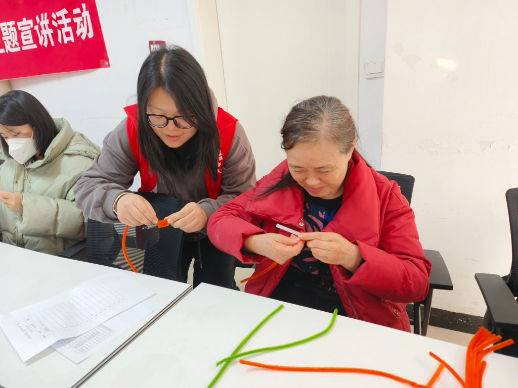 活动开始前,驻站社工带领大家进行手指操热场活动,一招一式,有效锻炼了手部的灵活性。随后,社工向大家展示制作成品,说明了此次活动的目的及意义,同时邀请志愿者赵老师为大家讲解制作方法,并为大家分发制作材料。在社工和志愿者的协助以及居民彼此的互助下,居民们开始动手制作专属自己的“小柿子”,通过扭、绕、折等一系列动作,一根简单的扭扭棒,逐渐变成一个个栩栩如生的小柿子。曹阿姨拿着“小柿子”说道:“这个活动不仅让我们享受了手工乐趣,还让我们交到了新朋友,柿柿如意,事事如意,真是个好寓意。”