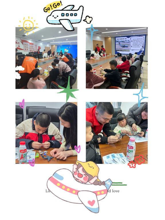 活动中,未保中心的工作人员向孩子们讲述了遥墙机场的变迁,并通过精心制作的PPT和生动的讲解,向参加活动的未成年人展示了飞机从早期的探索到现代飞机的演变历程。为了让孩子们更直观的了解飞机的构造,社工和志愿者现场带领他们组装飞机模型。孩子们的眼睛闪烁着好奇和兴奋的光芒,他们围坐在桌旁,跟随社工的详细讲解,认真地将飞机机身、机翼、机尾等零件一一组装。每个孩子都全神贯注,小心翼翼地将每个部件对准、固定,生怕一不小心就会影响模型的稳定性。很快,一架架漂亮的航模在孩子们的手中诞生,它们虽然只是缩小版的飞机,却承载着孩子们对天空的无限向往和对飞行梦想的初步探索。看着这些孩子们亲手制作的航模,我们不仅看到了他们对航空知识的渴望,也感受到了他们对未来的无限憧憬。