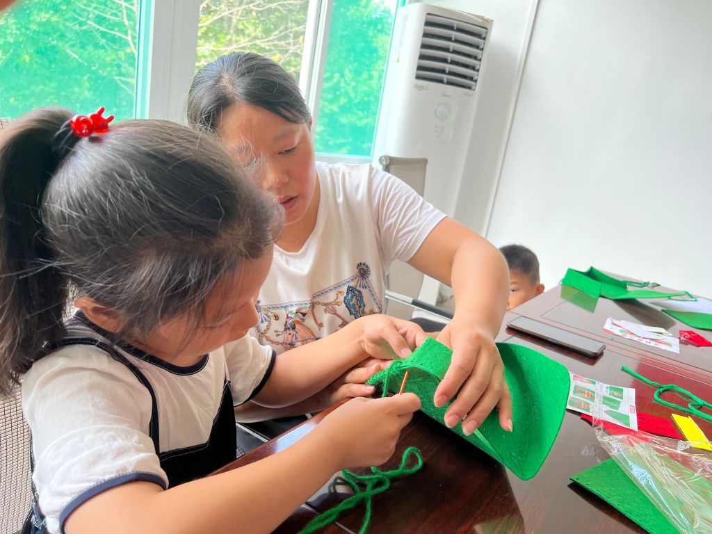 活动开始,社工给孩子们介绍中国人民解放军及建军节的由来和意义,让大家感受到我们今天来之不易的幸福生活,离不开军人的无私奉献。随后,社工分发手工材料,为小朋友们详细讲解了手工DIY红军包的制作过程,并亲身演示,让小朋友更快掌握缝制技巧。从穿针、缝线、再到粘贴,小朋友无比专注。不久后,一个个漂亮精美的小红军包就缝制好了,孩子们都迫不及待地背起自己的小军包。