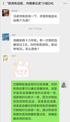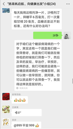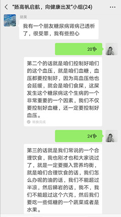 第二期健康互助支持小组之高血糖活动是由项目组社工郭雪伟来策划实施的,高血糖小组活动第一课的主题内容为“认识高血糖”。社工从老年高血糖的定义、特点以及与糖尿病的关系等内容,以语音发送聊天消息的形式与群聊中的小组成员展开互动,进行高血糖相关知识的问答。群聊中有一位患有近10年的糖尿病的成员线上询问日常如何控制血糖以及一些用药方面的困惑和糖尿病并发症——糖尿病肾病的标准,社工及时查阅网上医师讲解并给予相关专业知识解答,解决成员内心的疑惑和惶恐。