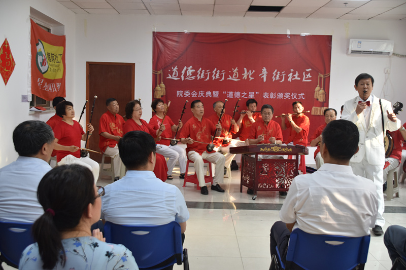 本次院委会庆典以文艺节目展演的形式进行,社区各队伍纷纷拿出自己的拿手节目,民乐合奏《采茶舞曲》+《扬鞭催马送粮忙》、《家风家教三句半》、舞蹈《中国歌最美》、情景剧《小院故事》、《中华通络操》等社区工作者同辖区居民一道自编自演的节目受到了居民的热烈欢迎,最后,道德风民乐团周长荣领唱《我和我的祖国》带动全体居民大合唱更是将庆典推向了一个高潮。“道德之星”颁奖环节,社区表彰了一批在北辛街“老一代的家舍邻里,新一代的时尚居所”建设中涌现出来的“志愿服务之星”“敬业奉献之星”“助人为乐之星”“孝老爱亲之星”“感动社区之星”17人。街道办事处领导及上一届“道德之星”居民代表为获奖居民颁奖。