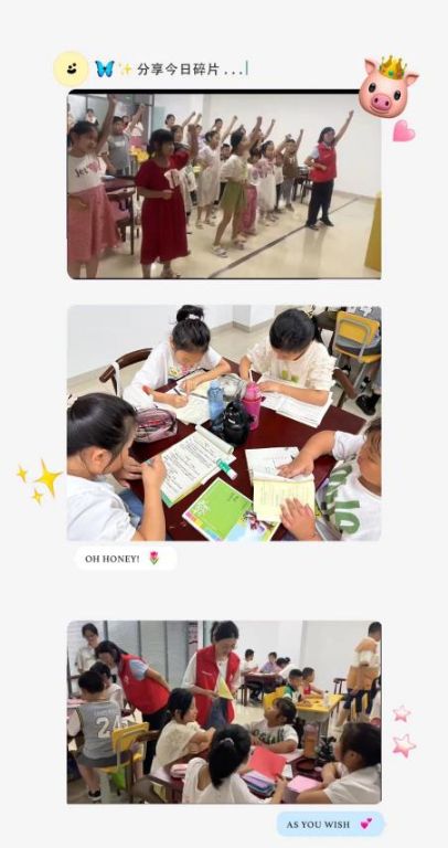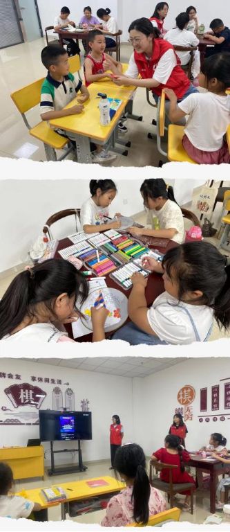 为了体现活动的多样性,每天上午以课业辅导为主、下午则是益智游戏手势舞、画画、跳操、折纸、猜谜语和观看微视频等活动交叉进行,为儿童们形成一种轻松愉快的学习氛围。下午社工带儿童们跳操,她们优美的姿势一点不输专业舞蹈员,接下来的画画课,社工为儿童们讲述酷暑夏天,如何为他人带人清凉。儿童们画扇子、帽子和游泳池,小朋友的奇思妙想为我们打开了一扇窗...