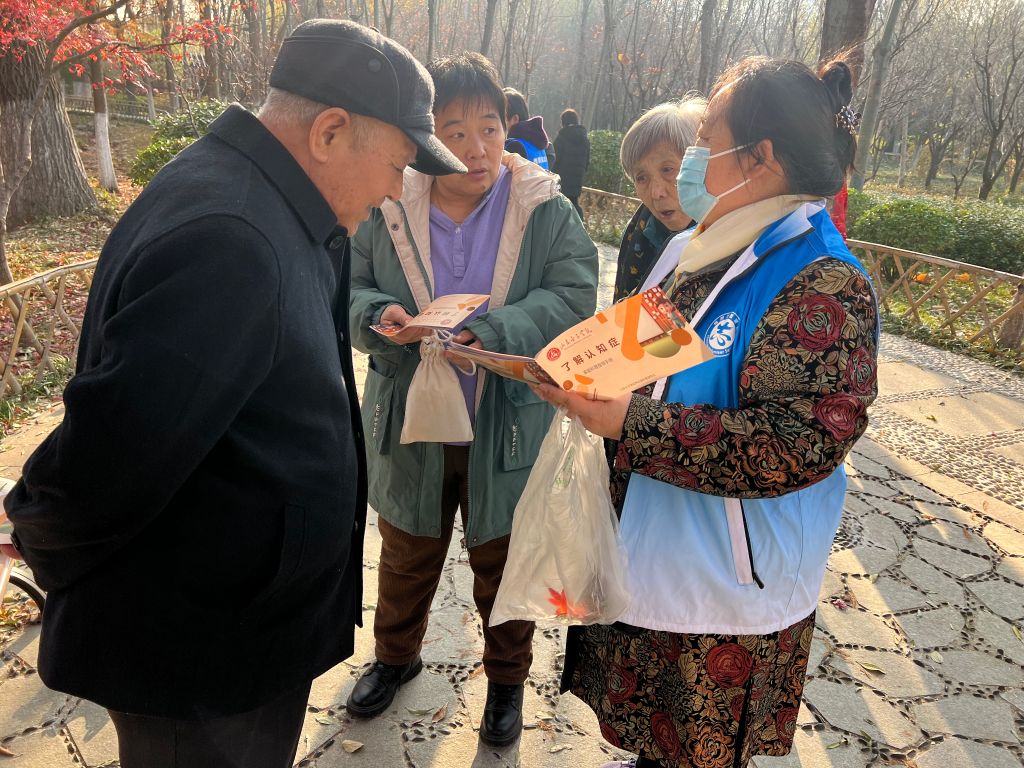 认知症,全名认知障碍症,又称“失智症”、“老年痴呆症”、“脑退化症”,是由于多种因素导致大脑神经细胞病变而引发的大脑功能衰退的慢性进行性老年病。资料表明,目前全球认知症人数已达5000万,预计到2050年,世界认知症人数将达到1.52亿。目前,我国认知症人数居世界首位。老年人每增长5岁,患认知症的概率将增加一倍。面对如此严峻的现状,段北社工站联合山东女子学院养老管理专业的学生,共同开展了认知症宣讲及筛查活动,目前活动已经开展了3次。为了加大认知症宣传力度,活动中同心缘的志愿者们向在公园里休闲的老人们发放了认知症的宣传册,并进行相关知识的讲解,提高人们对认知症的认识。