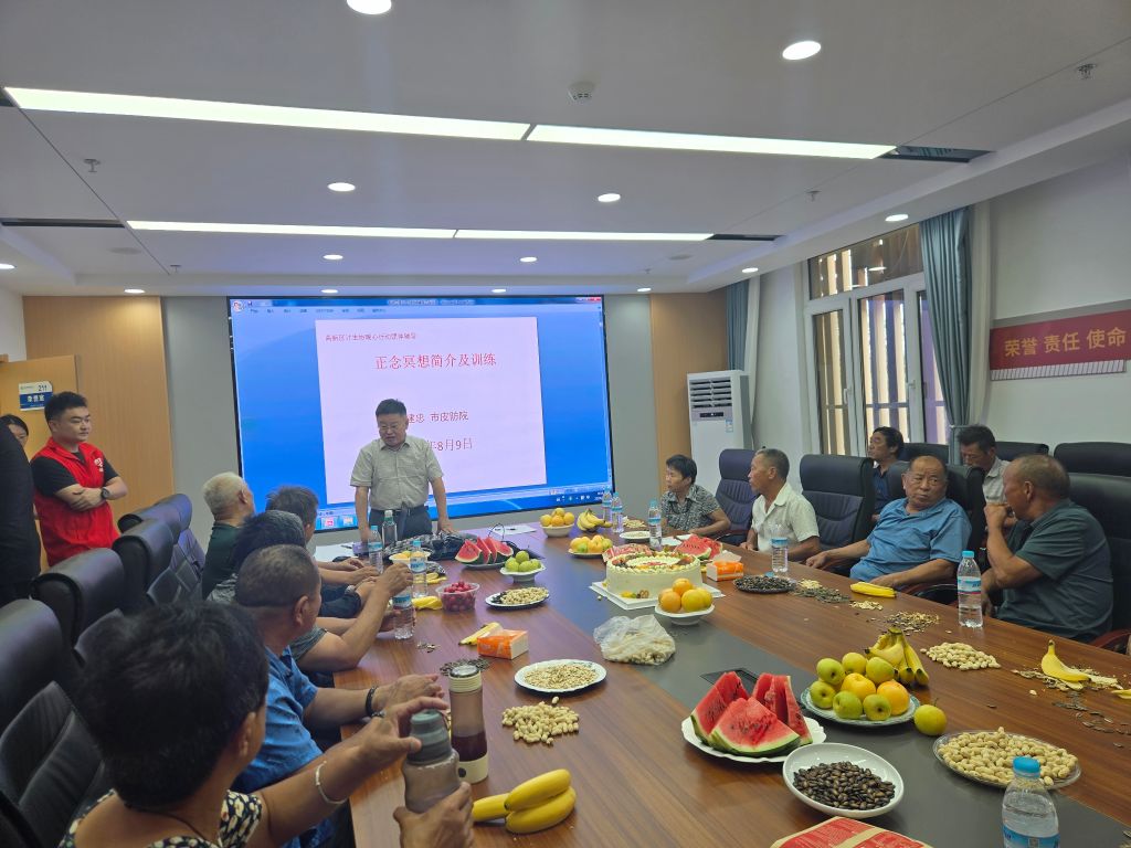 还邀请了市皮防院的冯建忠老师进行了授课,课上分享了正念冥想的概念及如何进行的方式方法,以此来帮助失独老人排解心理压力。