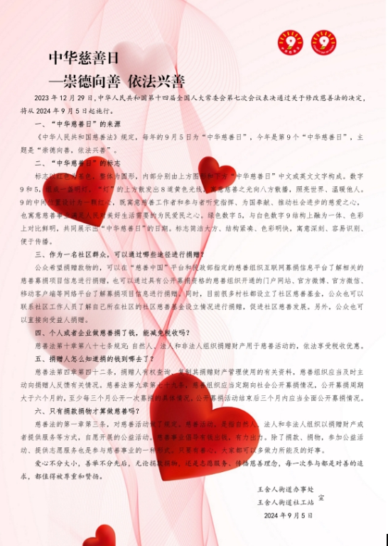 “崇德向善 依法兴善”——王舍人街道社工站开展“中华慈善日”宣传活动